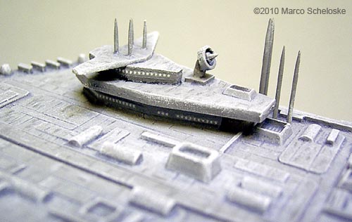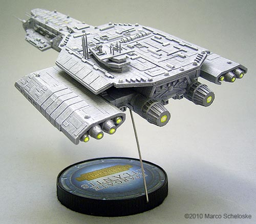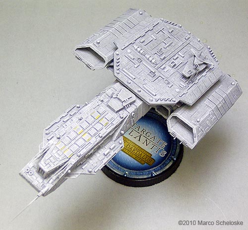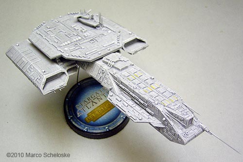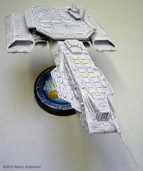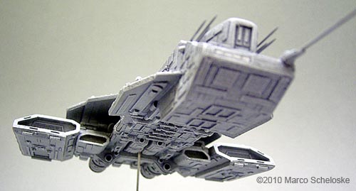 Here my version of Saltire Technologies BC 304. I built this model from a very early casting back in 2008. All antennas are shorted needles. I tried something new regarding the paintjob: I painted ALL hull panels one by one with so called 'Polychrome'-pencils. Those are available in a lot of colors from the Pantone-range, and are 'color-guaranteed'. This means that you can buy a pencil in 2008, and another one in 2010, but the color will be exactly the same. Finally I used my fingers to slightly blend the panels into the base color, and sealed it with a clear dullcoat. The painting step by step was: Base color done with Games Workshop „Codes Gray“. Heavy drybrushing with Games Workshop „Fortress Gray“. Some details were painted Revell 78 dark gray. Wash with dark gray oil color. Hull panels painted with 5 different Polychrome gray pancils. Clear dullcoat, final slight white drybrushing for highlights. The base is selfmade, the engines are filled with yellow daylight glowing color with a small white center as a 'hotspot'. |